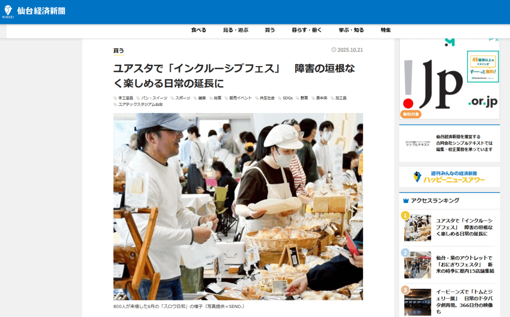 2025.10.21 【メディア情報】仙台経済新聞に掲載されました! 10月25日開催のインクルーシブフェスティバルの記事を仙台経済新聞に掲載されました。 こちらのリンクからからご覧ください。 https://sendai.keizai.biz/headline/4281
